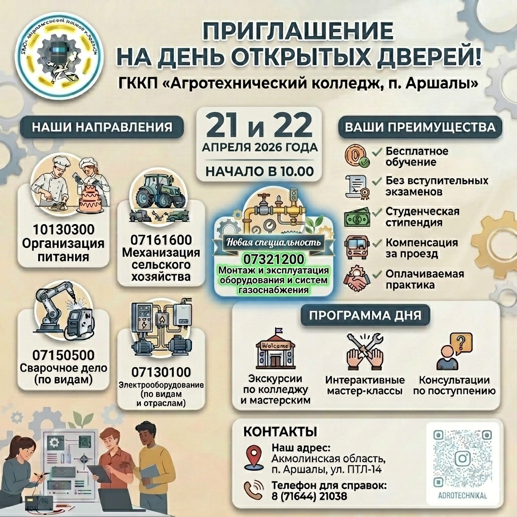 21.04.2026 года в рамках профориентационной работы в ГККП «Агротехнический колледж, п.Аршалы» прошло мероприятие «День открытых дверей» для учащихся 9 классов школ Аршалынского района. Охват - 148 человек.